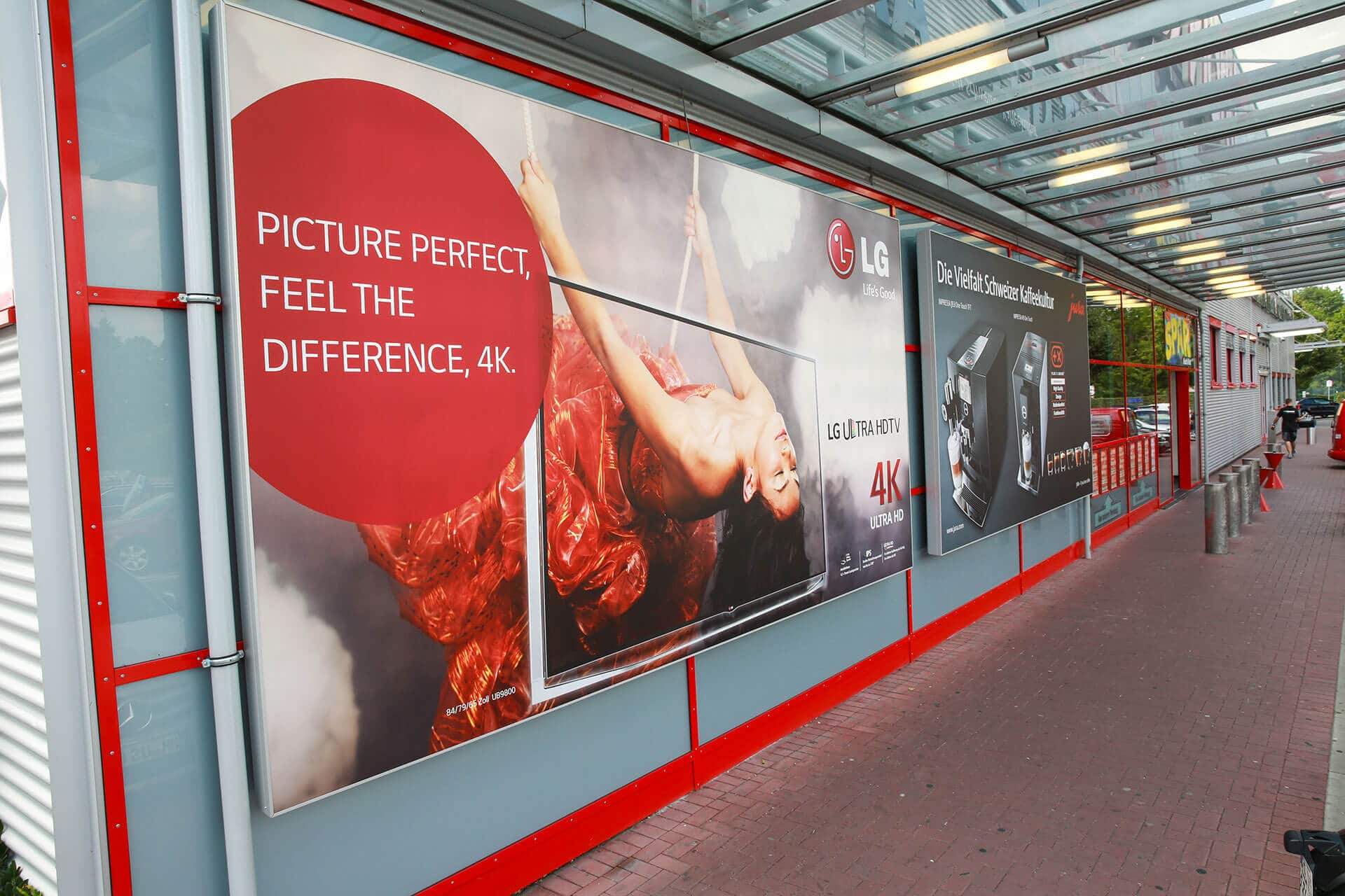 Das FRAMELESS Outdoorsystem ist speziell für den Einsatz im Außenbereich konzipiert: Rahmen und Textil-Großformatdruck sind wetter- und UV-beständig. Darüber hinaus verfügt die Konstruktion über einen Diebstahl- und Vandalismusschutz; das Handling des Motivwechsels ist dennoch simpel.